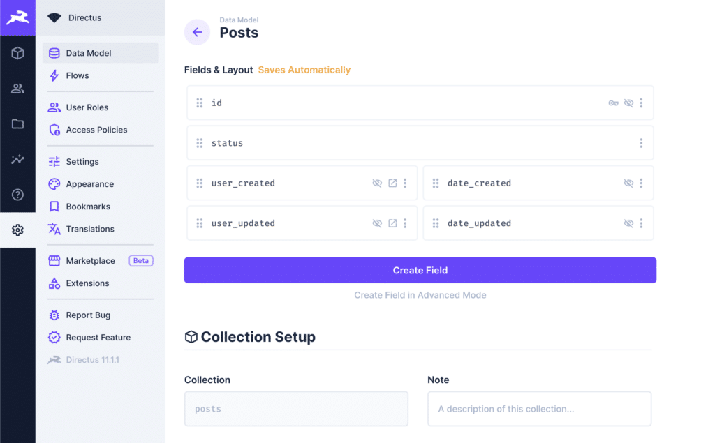 Interface de Directus montrant la création automatique de collections avec des champs personnalisés.